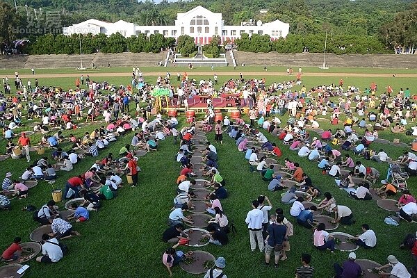 2013南投世界茶業博覽會千人揉茶活動10日傍晚在中興新村大操場舉行,500個揉茶笳藶在草地場呈放射狀排開,相當壯觀!代理縣長陳志清、縣府秘書長陳朝旺、農委會茶改場場長陳右人等,都是夫妻一起體驗揉茶樂趣,許多民眾更是全家大小一起參加。
