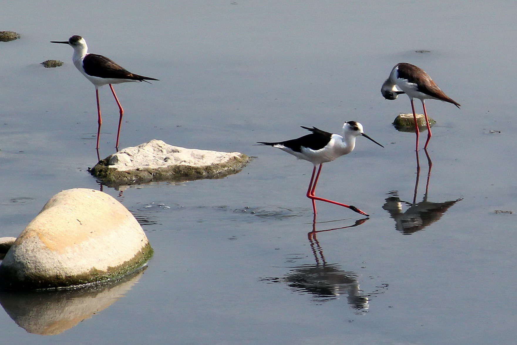 不過,現已是四月中旬。這段水域仍有約20隻的高腳鴴滯留未離開,牠們三三兩兩地在淺灘覓食,悠閒而高雅,似乎是豐饒的水族讓牠們樂不思蜀,忘了北返的歸期。