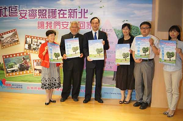 市長朱立倫、台大醫院金山分院院長黃勝堅、衛生局長林雪蓉等出席社區安寧照護上路記者會。(記者黃村杉攝)