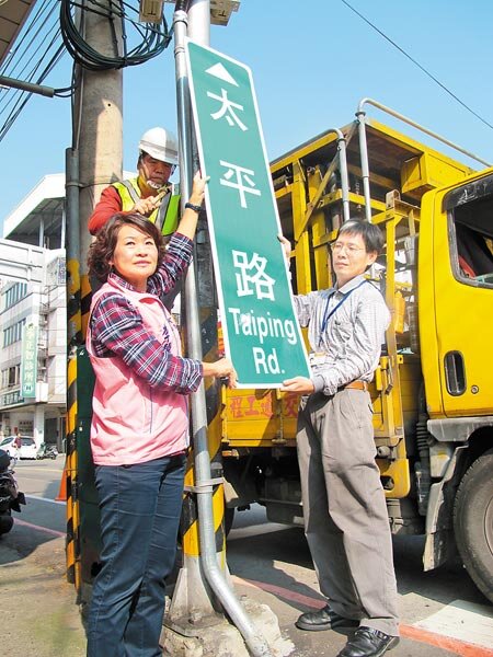 台中市太平區太平路與永成北交叉路口的鐵製路標,因掛得太低,離地僅有一百卅五公分,機車騎士轉彎時,常不慎擦撞,造成人車摔倒受傷,兩個月來已有六個人受傷,市議員李麗華接獲陳情,要求交通局改善,提高路標看板的高度,避免路標成為「撞頭版」。
