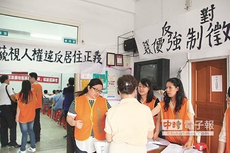 「藐視人權、違反居住正義」、「反對賤價強制徵收」,台南市地政局昨天在中西區大涼里活動中心舉辦中國城暨運河星鑽區段徵收協議價購會時,會場外懸掛一面面的白布條,代表住戶對政府低價收購的不滿心聲。