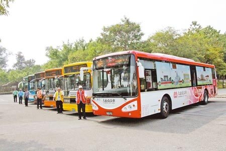 台南市6大幹線的隱藏版主題公車,首度會師市府廣場。(洪榮志攝)