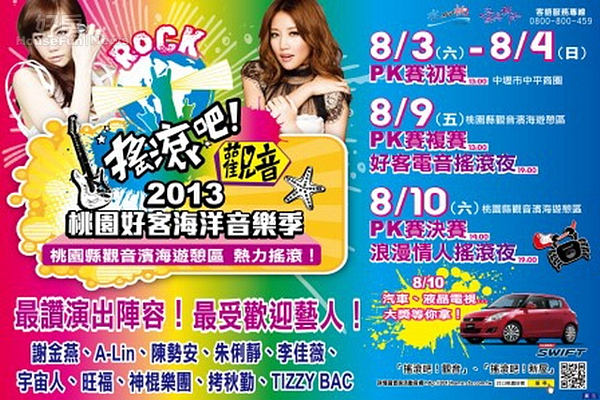 想看各路英雄好漢熱血PK搖滾樂嗎?由桃園縣政府客家事務局與觀音鄉公所共同舉辦的「2013桃園好客海洋音樂季~全國搖滾音樂PK賽」初賽,8/3(六)和8/4(日)在中壢市中平商圈(中平路152號之2)熱烈展開,桃園縣政府歡迎您一起來為您喜愛的樂團大聲加油。