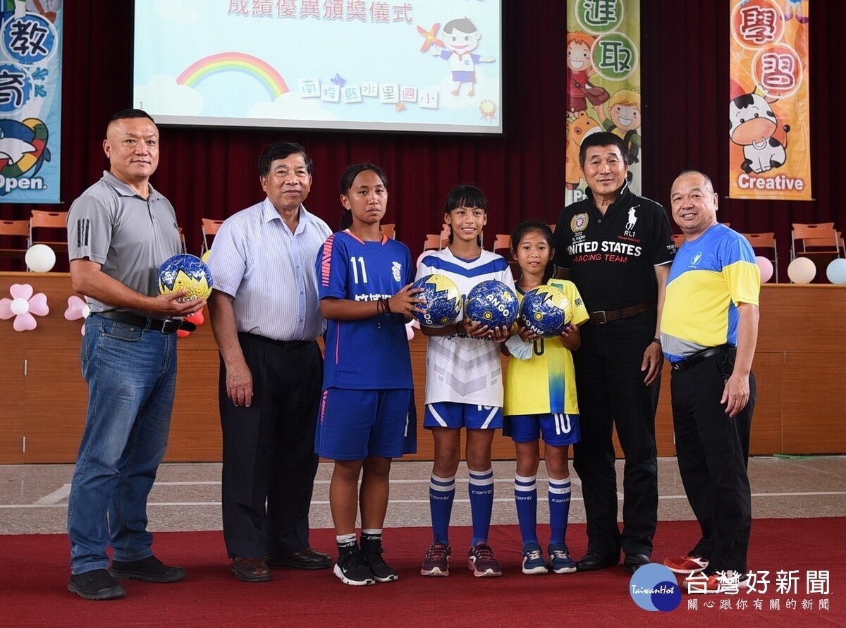 南投縣體壇今年真是閃亮亮,繼5月新豐及中正國小打出第3和第7佳績之後,水里國小女足隊更在全國少年盃足球錦標賽中,奪下女子小五及小六雙冠后及四年級殿軍,成為今年女子組最大贏家,為水里國小創造了新的足球史,副縣長陳正昇22日與璉紅台體南投培育中心技術總監、台灣體育運動大學趙榮瑞教授至水里國小,頒發縣長獎狀獎勵足球隊員並贈送足球。