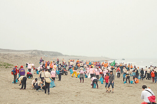 桃園縣政府環保局等單位昨天在竹圍漁港進行春季淨灘,近千名志工共清出8.4噸垃圾。 (圖/楊德宜攝)