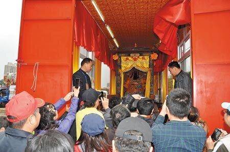 山西省運城解州關聖帝君祖廟恭奉的本尊神像,10日到竹北市遶境,信眾爭睹及拍照。(羅浚濱攝)