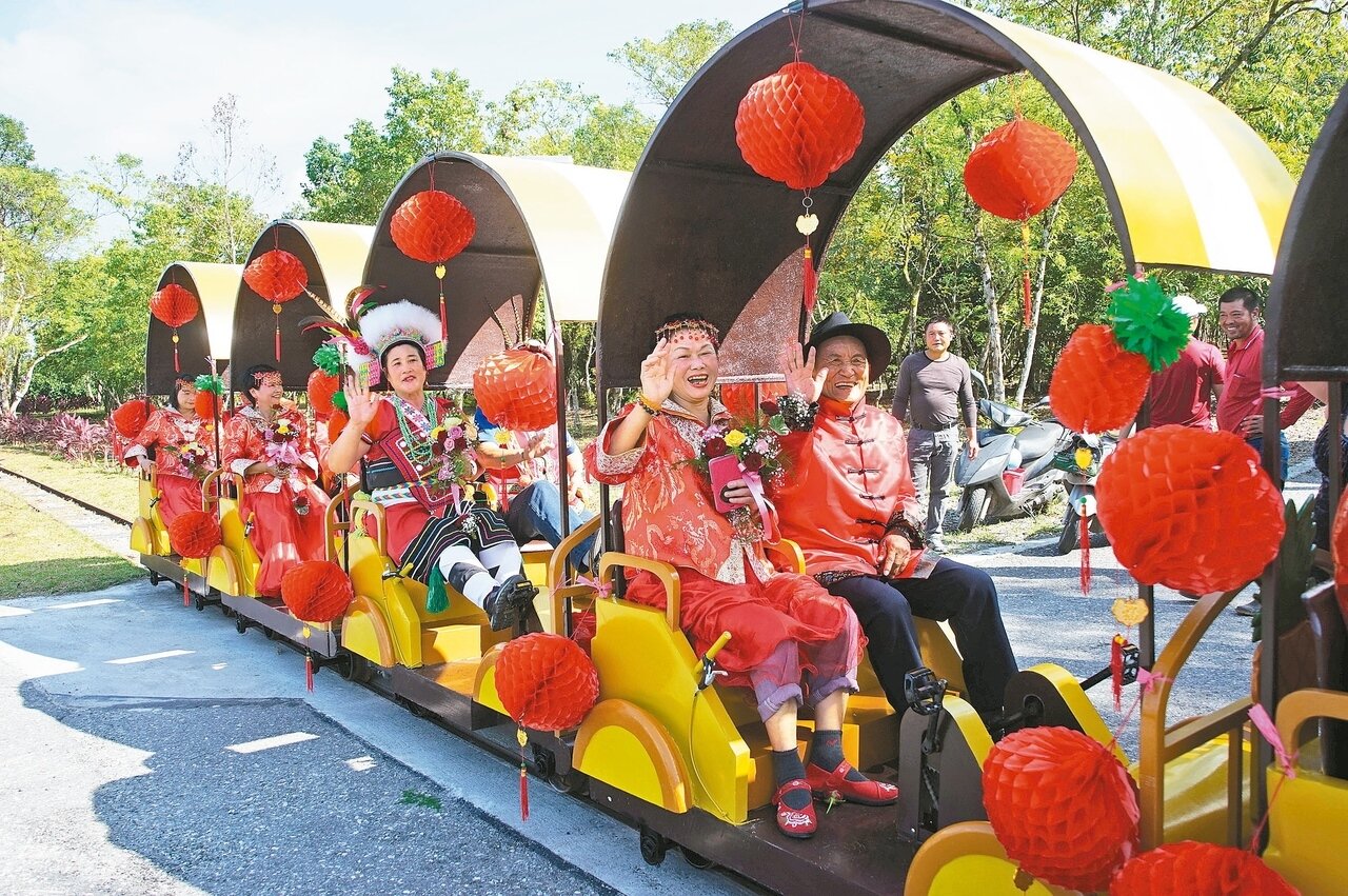 輕軌列車軌道全長1314公尺,諧音「一生一世」,水保局花蓮分局昨舉辦「千歲婚禮」,邀社區10對結婚逾50年的夫妻穿上喜氣洋洋的禮服,搭上1314幸福列車遊園,也以辦喜事的心情,迎接輕軌列車正式啟動。
