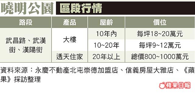 永慶不動產北區崇德加盟店專案經理許美惠指出,該公園周邊以屋齡10~20年中古大樓為主,分布在武昌路、武漢街、陝西東4街等路段,主力以3~4房為主,以含車位40~45坪、3房物件最受歡迎,每坪9~12萬元。
