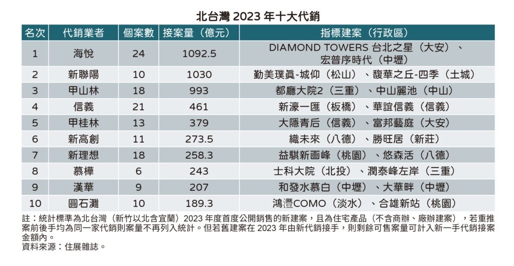 住展雜誌統計排行北台灣2023年十大代銷在住宅產品接案狀況(不含商辦、廠辦建案),依接案量統計依序為海悅、新聯陽、甲山林、信義、甲桂林、新高創、新理想、慕樺、漢華、圓石灘。前十大代銷接案量介於189.3億元至1092.5億元,總接案量來到5126.6億元,相比2022年的5951.1億元下修13.9%。
