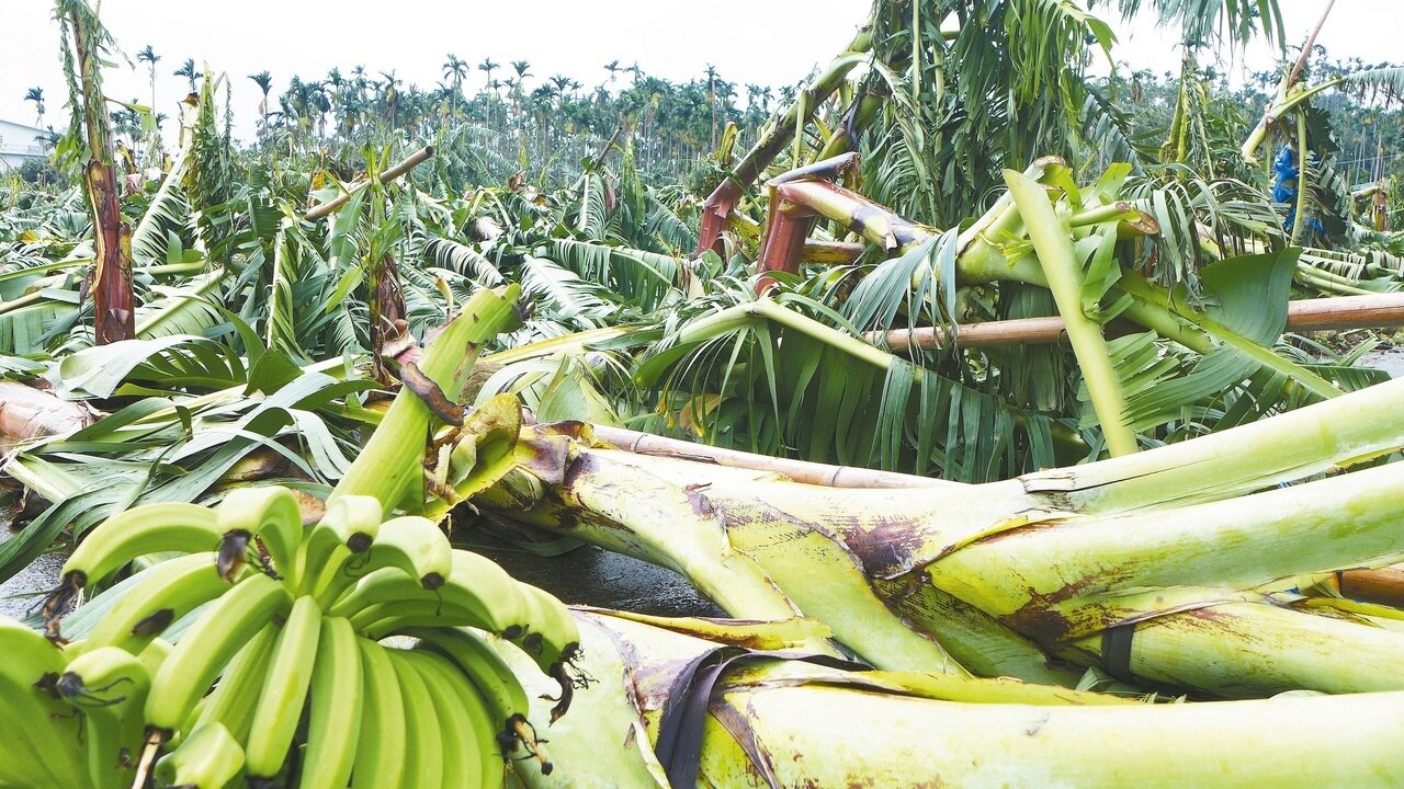「只剩2周就可收成,如今卻夷為平地!」蕉農吳俊賢眼眶泛淚說,為了防颱,還先加派人手,在每棵香蕉樹上插竹竿、綁繩固定,但仍敵不過強大的回南風吹襲,不僅多花費工資補強防颱,1年栽種的成本也全泡湯,下一次收成還要再等10個月,真是欲哭無淚。