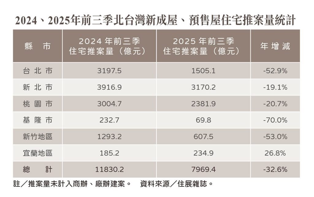 此況自然干擾建商推案態度,新案能延就延,九月初的新青安豁免房貸天條水位,與換屋族切結期延長兩利多亦無濟於事,住展雜誌統計北台灣第三季住宅類新成屋、預售屋總推案量僅推出約1800億元案量,亦反映九二八檔期狀態堪憂。而今年前三季的新屋約推近8000億元案量,年減近3900億元,減幅超過三成,與去年前三季就已破兆元的順風順水情勢大相逕庭。