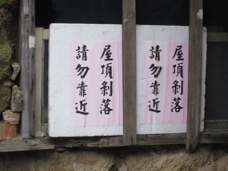 前往鳳飛飛的昔日住處(一)有間土角厝由於年久失修十分危險,屋主為免發生意外特別寫下屋頂剝落(二),請勿靠近,讓遊客行經倍感壓力。(攝影/記者陳寶印)