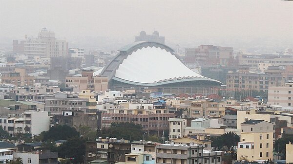 沙塵暴來襲,苗栗市地標建築巨蛋體育館,被灰濛濛的空氣包圍。 記者范榮達/攝影
