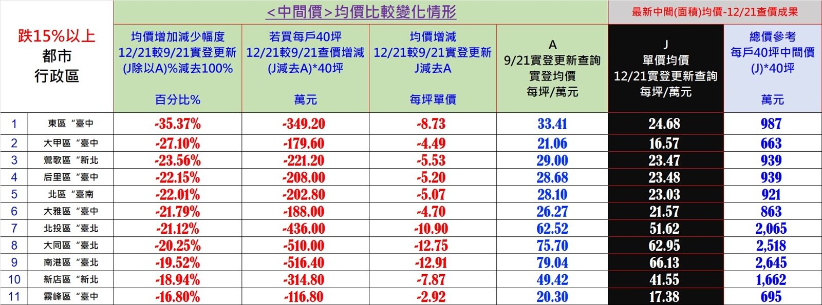 而已有11個行政區跌價超過15%,其中台中市東區均價下跌35.37%幅度最大,另外台中大甲、后里、大雅區,以及北市北投、大同區,還有新北鶯歌、台南北區的跌幅均超過2成,另外台北南港、新北新店、台中霧峰也分別下跌19.52%、18.94%、16.8%,主要集中於台中、北市。