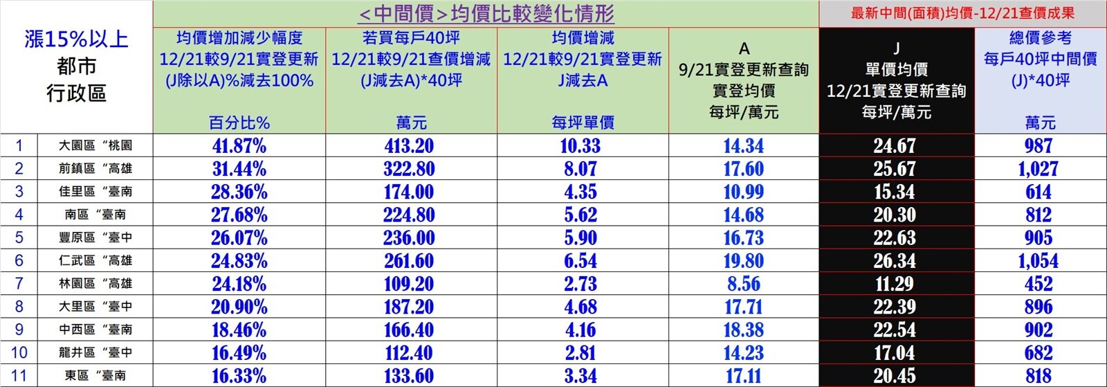 不過,也有11個行政區價漲逾15%,拔得頭籌的是桃園大園區,漲幅超過4成,接著依序為高雄前鎮區31.44%、台南佳里區28.36%以及台南南區27.68%、台中豐原26.07%,普遍集中於中南部。