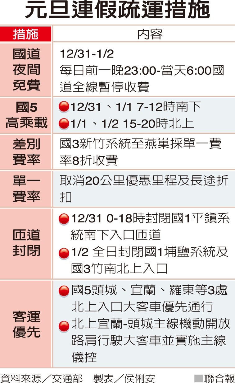 元旦三天連假將至,交通部宣布,連假期間自十二月卅一日到明年一月二日,每日從前一晚十一時至當日凌晨六時,國道全線雙向暫停收費。