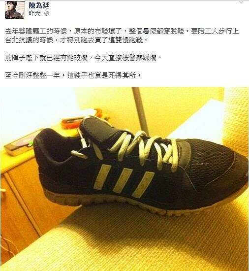 陳為廷在自己臉書po上砸苗栗縣長劉政鴻的鞋子,並表示,這隻鞋子是死得其所!(翻攝自陳為廷臉書)