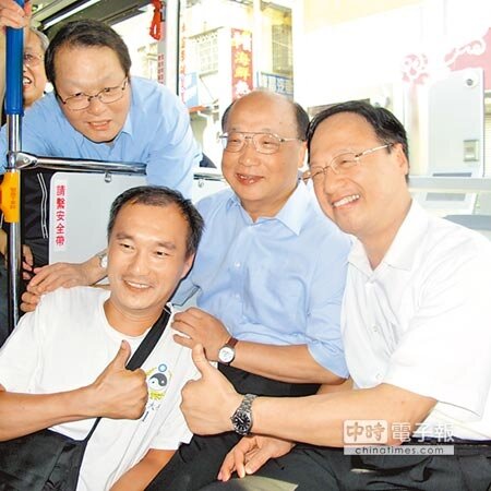 行政院長江宜樺(右)搭乘台中BRT,車上遇見支持者,熱情合照。(截取自中時電子報)