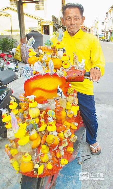 「鴨鴨是從小夢寐以求的玩具」,68歲蔡進興屏東琉球人,從小對黃色小鴨情有獨鍾,將機車改造成全島唯一「鴨鴨車」騎著四處趴趴走,路上看到孩子好奇眼光會停下讓他們把玩,蒐集孩子歡笑聲成他退休後最大樂趣。