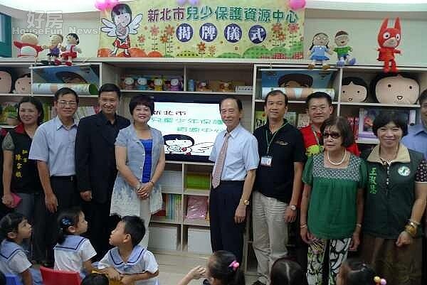 立委江惠貞、社會局專門委員林昆宗、家扶基金會社工處處長王聖基、新北市家扶扶幼主委盧政治及家扶中心主任周大堯等出席揭牌儀式。(記者黃村杉攝)