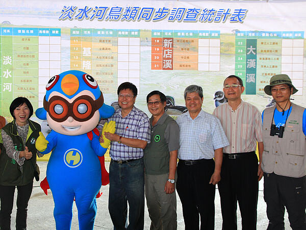 新北市政府水利局為全面普查淡水河域鳥種及棲息狀況,與台北市野鳥學會合作,10日在華江橋下大漢溪濕地生態廊道服務中心前舉行「2012淡水河鳥類同步調查」啟動活動記者會,市府秘書長陳伸賢親自出席主持,水利局長張延光、議員王淑慧、生態界專家學者、NGO組織等出席。