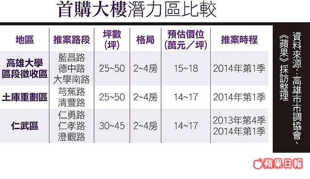 聯義廣告業務部經理方双志表示,以高雄大學區段徵收區為例,目前已成屋的首購大樓僅2案,但今年至明年楠梓將有近20件大樓新案動工,總戶數近3000戶,都是首購產品,預計明年第3季或第4季開始會有一波首購大樓熱潮,將是明年最夯的首購大樓集中地。