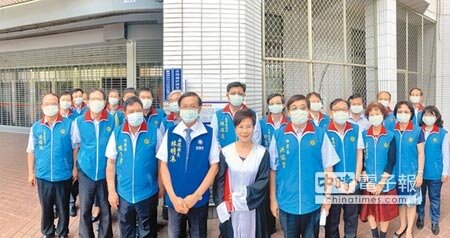 南投縣長林明溱(左四),29日率縣府主管控告中火,並戴上口罩抗議空氣汙染。(廖志晃攝)