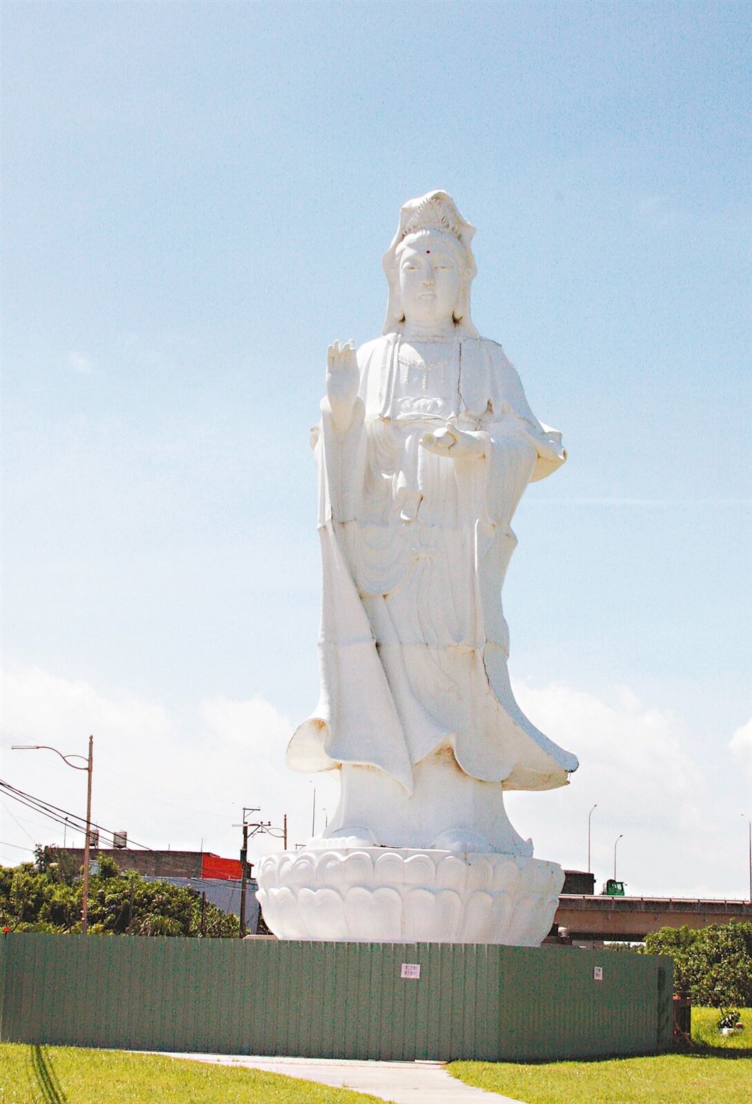 市議員歐炳辰指出,這尊觀音雕像背部,近來突然毀損崩落,雖然區公所在周圍圍起圍籬,避免民眾靠近,但怎麼看,這尊觀音雕像都破損到無法修復,以「觀音像」為觀音在地象徵,「應拆除重建」。