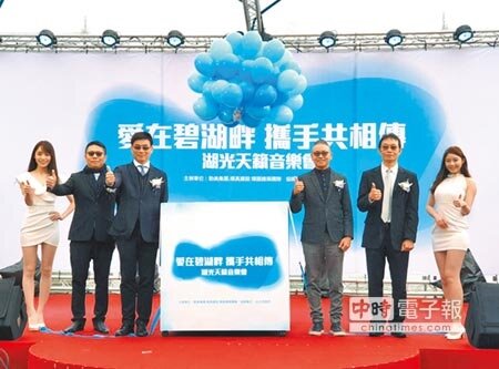 勤美集團璞真建設與璞園建築團隊昨共同宣布,於今起一連2天聯手於內湖區碧湖湖面上,舉辦公益水上音樂會。圖為璞真總經理汪家玗(左三)與璞園建築團隊副董事長陳俊良(左四)連袂出席昨日會前記者會。(王莫昀攝)