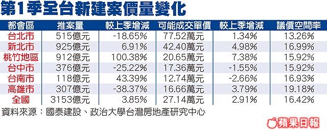 今年第1季全台新建案市場呈價量俱揚,創1年來最佳情勢。昨公布的國泰房地產指數顯示,台北市房市火車頭地位被桃竹地區取代,桃竹的價、量分別較去年第4季成長7.38%、147.80%,均創下全台最高。玄奘大學副教授花敬群說,現階段房市出現補漲或輪漲效應已到後段,房市潛藏賣壓,整體呈現「吉帶凶」。