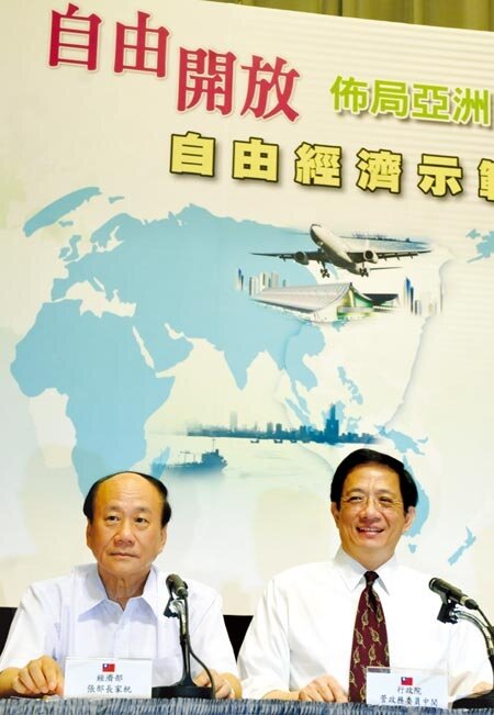 自經區第一階段,8日推動上路,圖為經長張家祝(左)、經建會主委管中閔(右),出席記者會說明方案內容做法。(記者洪錫龍/攝影)