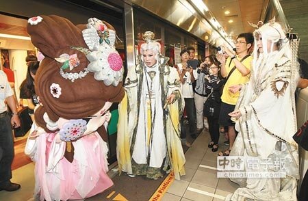 高雄捷運「霹靂武俠奇幻列車」22日首度亮相,首航儀式上霹靂武俠主角以捷運車廂為戲台,吸引許多粉絲前來。(記者謝明祚/攝影)
