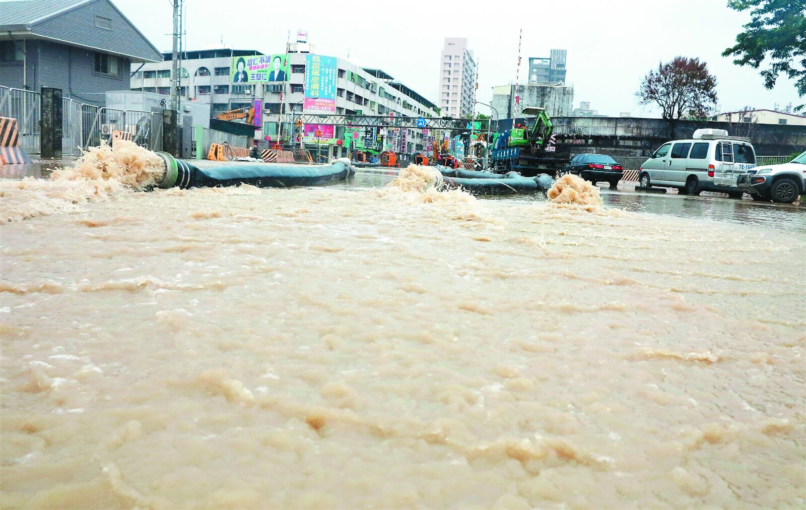 水漫街頭,市府水利局忙著調度大型抽水機,但災區排洪能力受限,即使將水抽到周邊,還是趕不上降雨速度;災區及周邊居民徹夜忙著舀水,不敢入睡,怨聲載道。