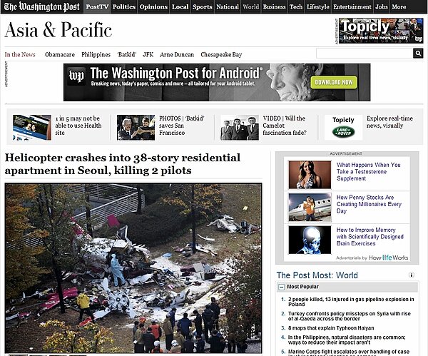 南韓LG的直升機失事墜機,撞毀一棟豪宅,兩名駕駛當場死亡。(翻攝華盛頓郵報網站)