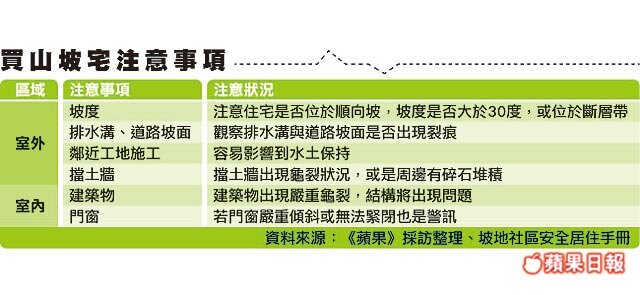 在詳察房屋所在地質的資料後,民眾實際看屋時還須觀察室內、外的擋土牆、排水溝以及道路狀況。中信房屋和平加盟店店長張明珠表示,若擋土牆出現龜裂、有小碎石堆積,排水溝出現排水堵塞的情況,很可能在遇到颱風帶來豪大雨時,爆發土石流的慘劇。