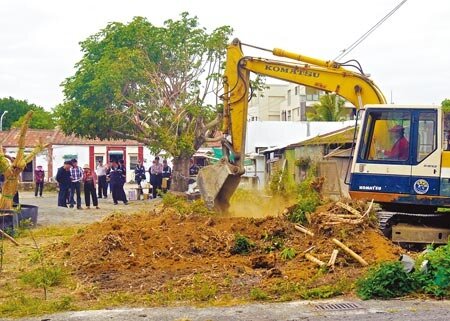 墾丁夏都昨天請來怪手,準備拆除預備新館土地上的盧家祖厝,引發民眾強烈抗議。(記者潘建志/攝影)