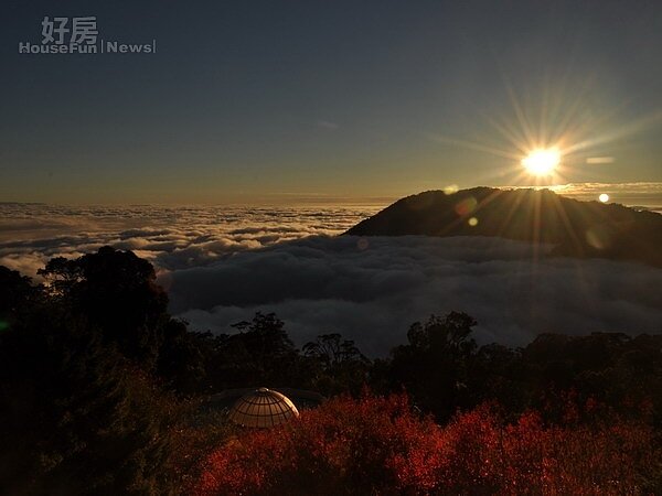 大雪山國家森林遊樂區內楓葉的一抹嫣紅映雲海及晚霞,呈現如詩如畫的浪漫美景。(圖/東勢林區管理處提供)