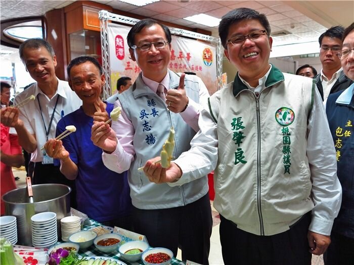 上午,龍潭三坑茭白筍整合行銷記者會暨桃映紅茶頒獎典禮,除邀請吳縣長頒發101年度桃園縣優質紅茶評鑑特等獎外,更有「紅燒美人腿」、「宮保美人魚」、「茭白筍沙拉」等創意料理上菜,吳縣長品嚐後豎起大拇指讚不絕口。