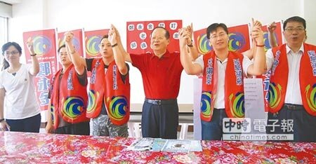 新竹縣長參選人鄭永金(右三)19日召開記者會,批邱鏡淳為了選票才政策急轉彎,放寬老人年金發放資格。(魯鋼駿攝)