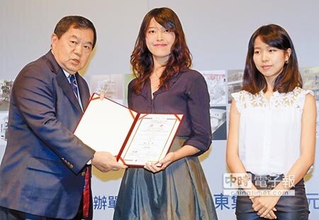 遠東建築新人獎舉行頒獎典禮暨遠東國際建築論壇,遠東集團董事長徐旭東(左起)頒給獲得新人獎的蔡昀庭、陳佳瑜,兩人將代表台灣參加「亞洲建築新人戰」。(截取自中時電子報)