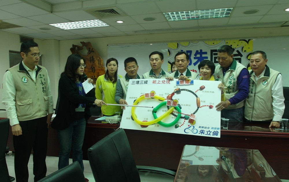 民進黨新北市議會黨團17日於議會舉行「雙北假合作、還我三環三線」記者會,李余典諷市長朱立倫勤跑全國,無心市政,指今年是朱市長政策面臨檢驗的一年;林銘仁說,路線核定及經費編列等,質疑中央並未全力配合,指朱市長騙很大,對市民是情何以堪?陳啟能批市長言而無信,指三環三線只看到劃線而已;張瑞山更有驚人之語,說三環三線目前都看不見,甚至在卸任前絕對也看不見!江永昌提起當初朱立倫參選市長時說「三環三線、我能實現」,如今看來是「三環三線、雙北齊騙!」