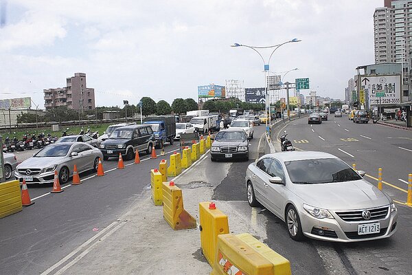 雖然這段路雙向各有3個車道,但長期施工的圍籬就占用1個車道,只要有施工車輛進出或交通事故,交通立即中斷,上、下班交通尖峰時段車子走走停停,得塞個20至30分鐘才能通過,駕駛人罵聲不絕。