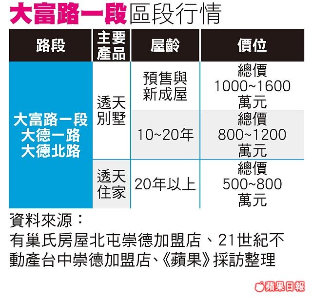 21世紀不動產台中崇德加盟店協理許銀益分析,除老透天外,該區有部分屋齡10~20年社區型別墅,總價800~1200萬元,主要分布大富路周圍巷道內。