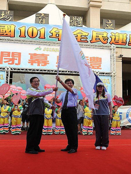 閉幕典禮體委會副主委錢薇娟蒞臨參與,縣長李朝卿致詞勉勵所有的選手,感謝體委會、縣議會的支持與協助,也感謝各縣市政府、裁判長,以及縣府團隊、各級學校的努力與付出,101年全民運動會共有22縣市隊本部259人;選手6066人;職員1248人;裁判859人參與盛會;大會工作人員將近萬人共襄盛舉;也頒發獎狀表揚101全民運動會贊助廠商;LED牆播放著這幾天各區精彩賽事、花絮及101全民運籌備回顧。