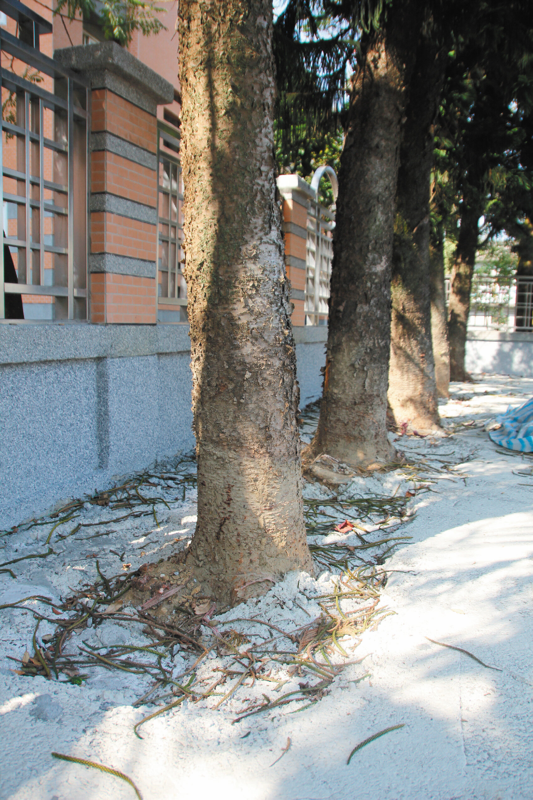 大溪國小校門前一整排的校樹,樹齡少則30年,多則百年,校長張明德說,當初看到施工人員放任水泥流到樹根旁也很傻眼,而且毫無清理跡象,現在樹根上方覆蓋厚厚一層水泥,很擔心樹木無法吸收水分。