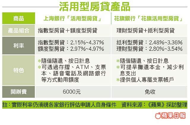 上海銀行「活用型房貸」為指數型房貸加上額度型房貸的靈活運用,上海銀行表示,指數型房貸的計價基礎以定期儲蓄利率指數與加碼利率為主,為每月攤還本息,若動用到額度型房貸的金額,須按實際動用天數計息,利率2.97%起。