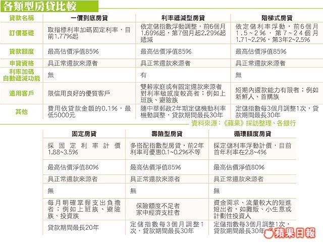 房貸產品琳瑯滿目,購屋人應如何挑選適合的房貸產品?坊間房貸大致可分為一般指數型房貸、抵利型、額度型或理財型房貸。亦有不少銀行業者推出結合2類型房貸優點的產品,提供民眾彈性的財務規劃。如上海銀行、花旗銀行均推出「活用型房貸」。