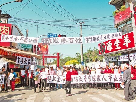 中山公園改造工程計畫強制徵收土地、收回原出租的國有土地等,影響周遭五十多戶居民生計,昨居民及商家出面舉白布條,抗議改造工程用地徵收案不公不義,提出三點訴求,包括重新按實價查估地價房屋、延至明年三月卅一日拆除、百分之廿五獎勵金依規定核發。