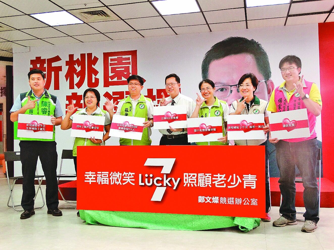 民進黨提名桃園市長參選人鄭文燦昨天偕各區市議員參選人出席政見發表會,端出「牛肉」。鄭文燦提出「Lucky7」7項社會福利政見,包括「4年2萬戶社會住宅」、「3歲以下育兒津貼每月3千元」、「每胎3萬元生育補助等政見」。