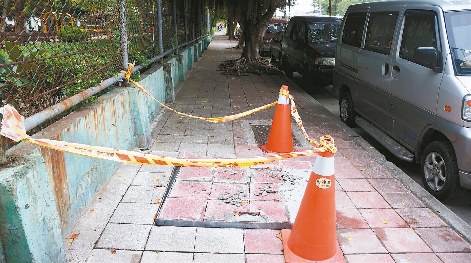 士林海光公園旁的人行道,近來傳出人孔蓋爆裂情形,且有陣陣臭味飄出。(記者邱瓊玉攝影)